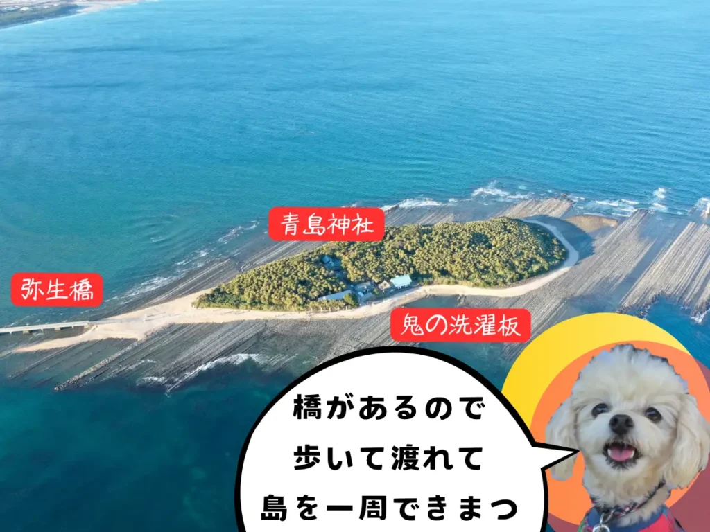 島の周囲には鬼の洗濯板があり、島内には青島神社が御鎮座しています