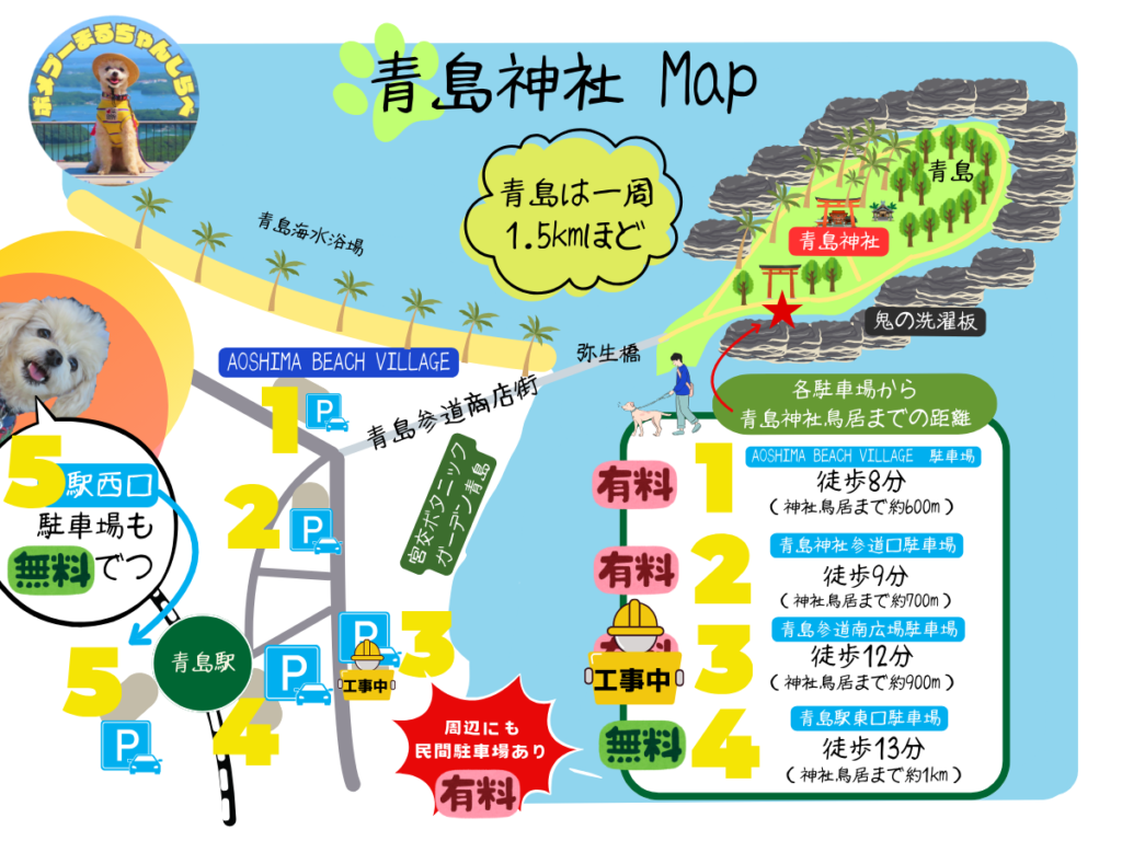 うん!青島はワンコ連れOK!広い島内を一緒に歩いて散策できるよー