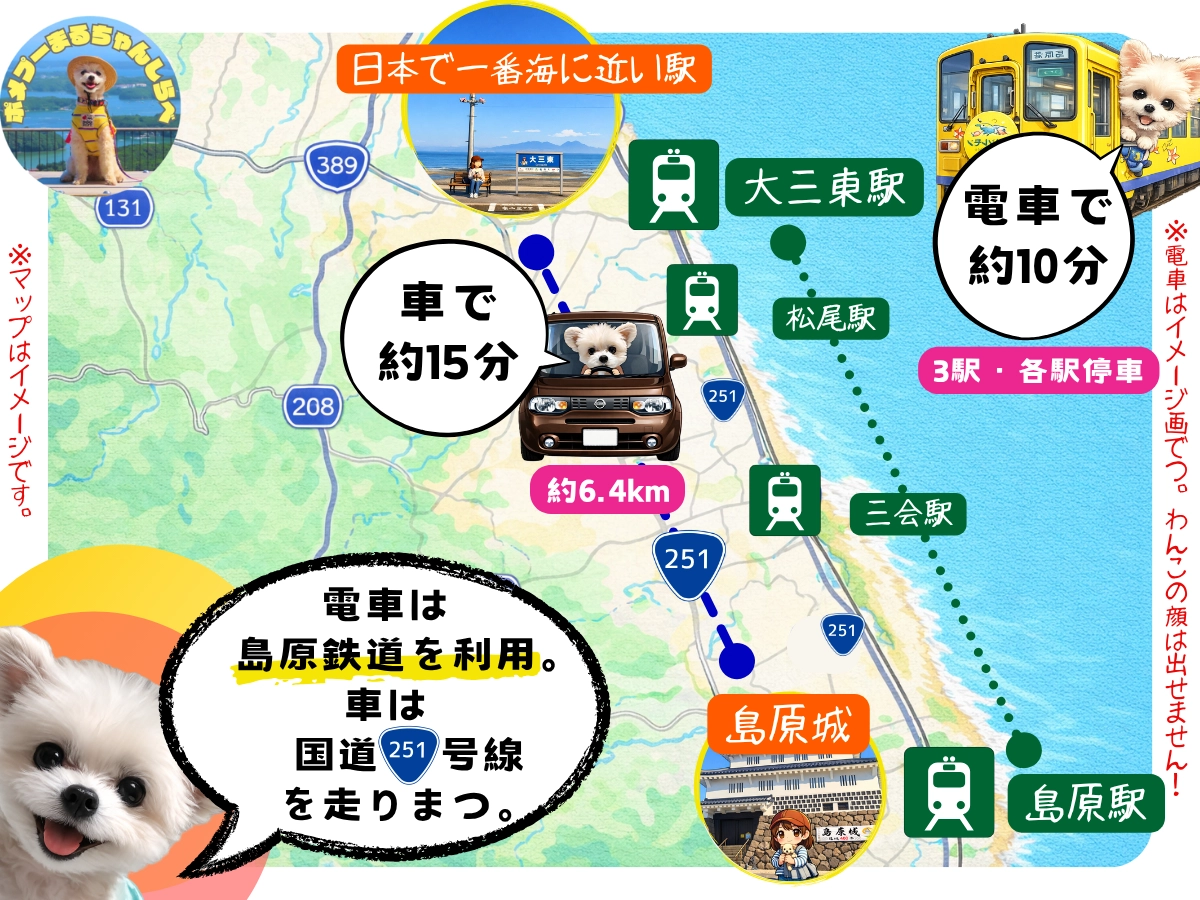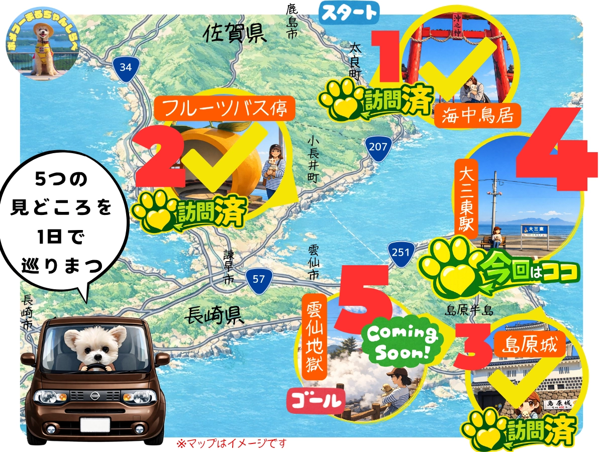 愛犬と島原半島を巡る1日旅。第4弾は映画やCMのロケ地として話題の大三東駅へ。駐車場やベストな行き方、所要時間の目安もご紹介。